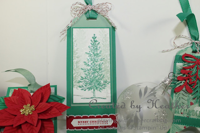 - For a smaller tag, I die cut several fir boughs from the Pretty Pines Thinlits along with some mistletoe and berries and a ribbon and built a swag right on the tag. The sentiment is from Tin of Tags stamp set. I love the Emerald Envy 3/8" Silky Taffeta Ribbon from the Combo Pack used for trim here. A little Candy Cane Lane Baker's Twine adds a finishing touch.